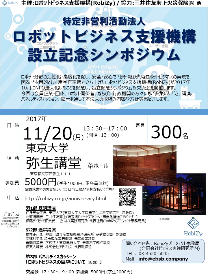 ロボット分野の活性化・高度化を促し、安全・安心で円滑・継続的なロボットビジネスの実現を図ることを目的として産学官連携で立ち上げたロボットビジネス支援機構(RobiZy)がNPO法人となるのを記念し設立記念シンポジウムを開催します。 今回は会員企業、ロボット関係者、ならびに行政機関の方々にもご参集いただき、講演、パネルディスカッション、展示を通して本法人の取り組み内容を紹介します。場所は東京大学弥生講堂一条ホールです。