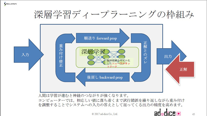 深層学習は人間の脳の神経網をモデル化したものです。従来手法とは違い、識別ルールのプログラミングの必要がなく、事象の識別が可能となります。