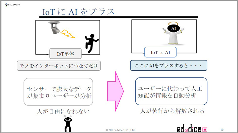 モノをインターネットにつなぐと膨大なデータが蓄積されます。人間の能力でデータ解析をすることが難しくなってきます。こういった場面では最初からAI化しておくことが重要です。